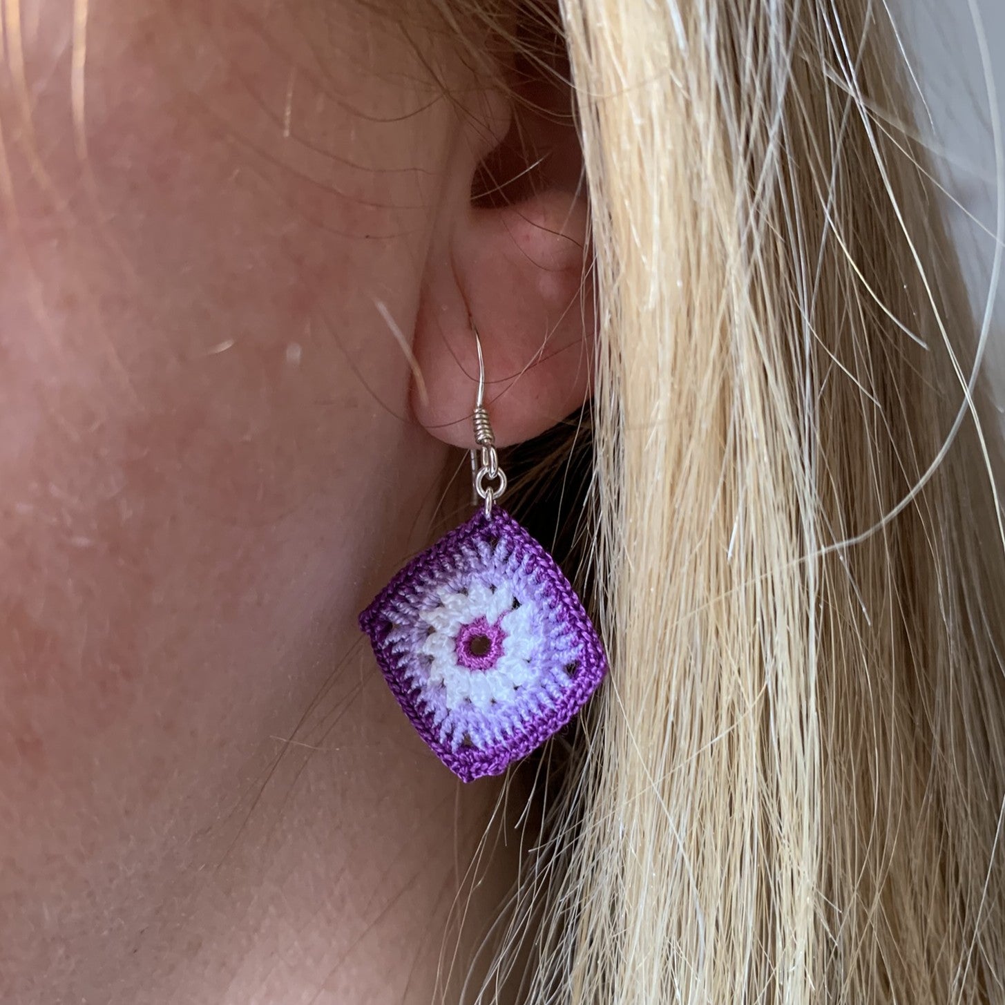Arracades artesanes d'estil monocromàtic que combinen diferents tonalitats d'un mateix color al voltant d'una flor amb pètals blancs. El resultat són unes arracades senzilles i versàtils. Estan elaborades amb fil de cotó i el ganxo i les anelles són de plata.