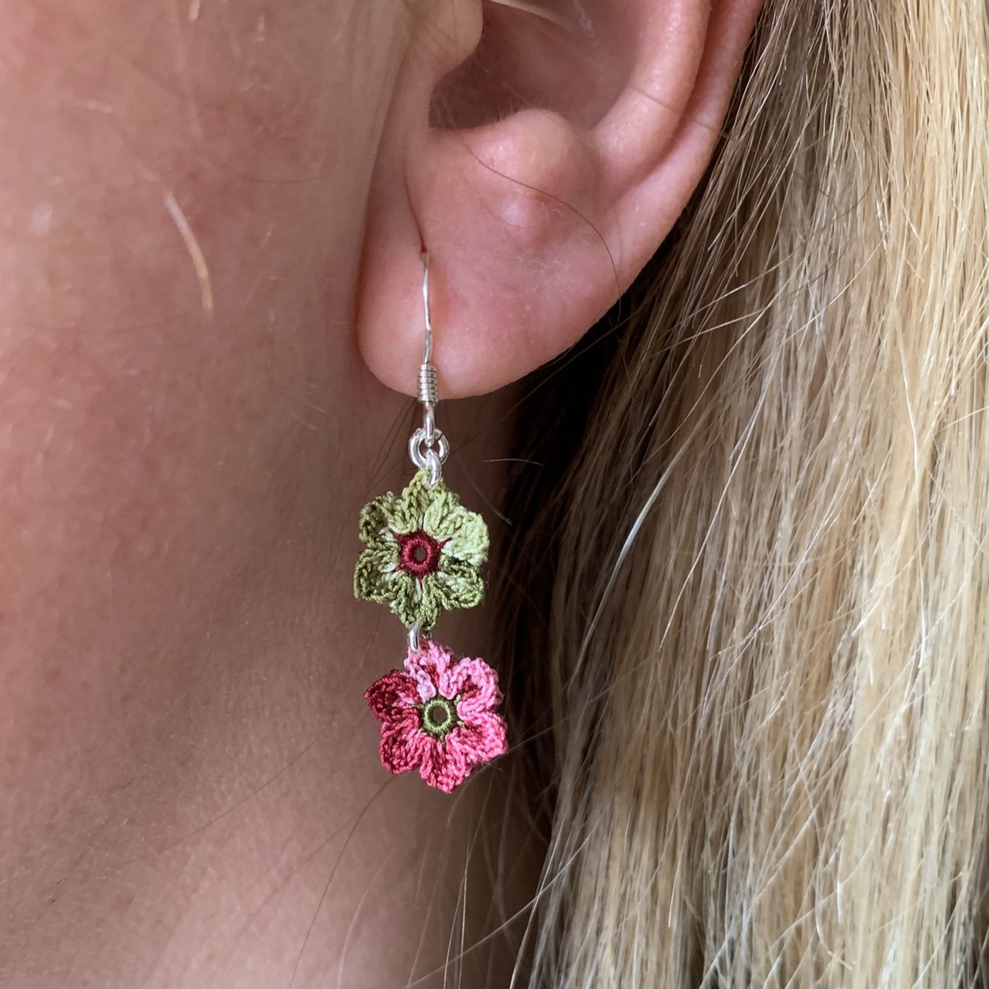 Arracades artesanes de flors de ganxet fetes amb fil de cotó. El contrast dels colors utilitzats dona com a resultat unes arracades acolorides i alegres. El ganxo i les anelles són de plata.