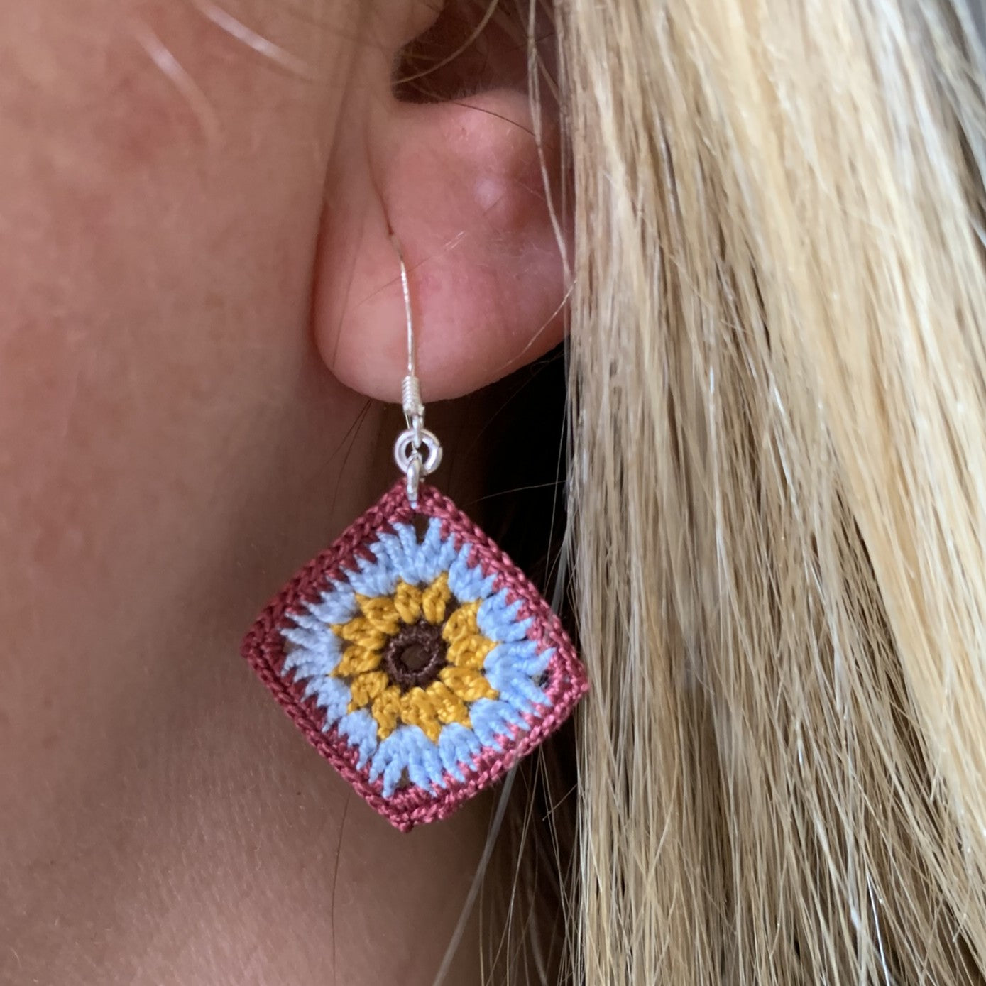 Les arracades Judith consisteixen en un gira-sol de color mostassa envoltat per una ronda de punts alts i una altra de punts baixos, en dos colors de contrast. Estan fetes amb fil de cotó i els ganxos són de plata.