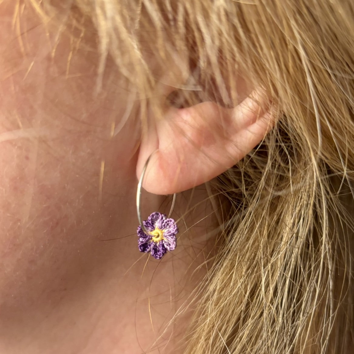 Cada peça artesana és diferent, i les arracades Pruna són una mostra d'això: dues flors fetes amb fil d'estil degradat en dos colors de contrast, que es complementen entre elles, acompanyades d'un aro molt fi de plata 925. El diàmetre de l'aro mesura 2 centímetres i cada flor mesura 1,2 centímetres aproximadament.
