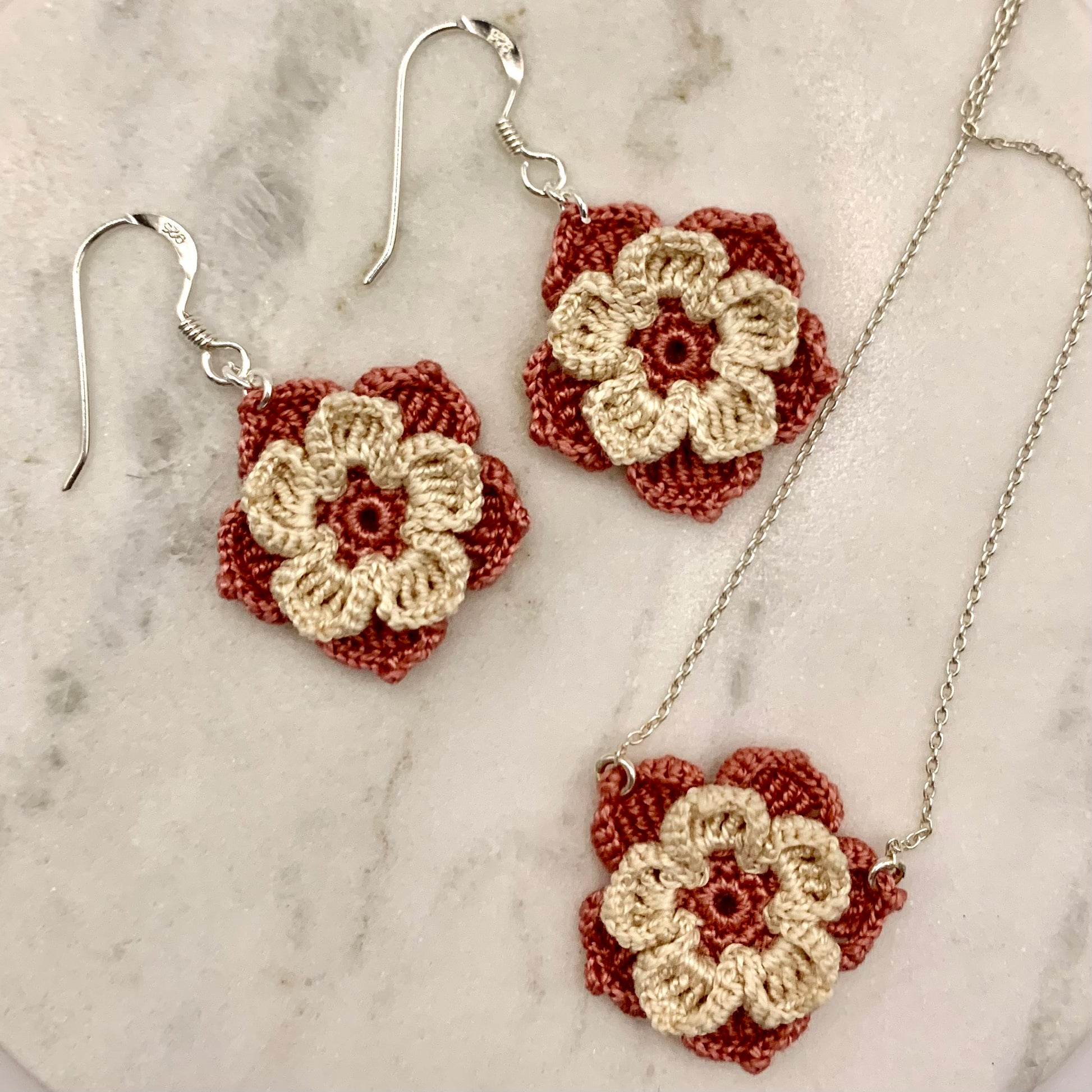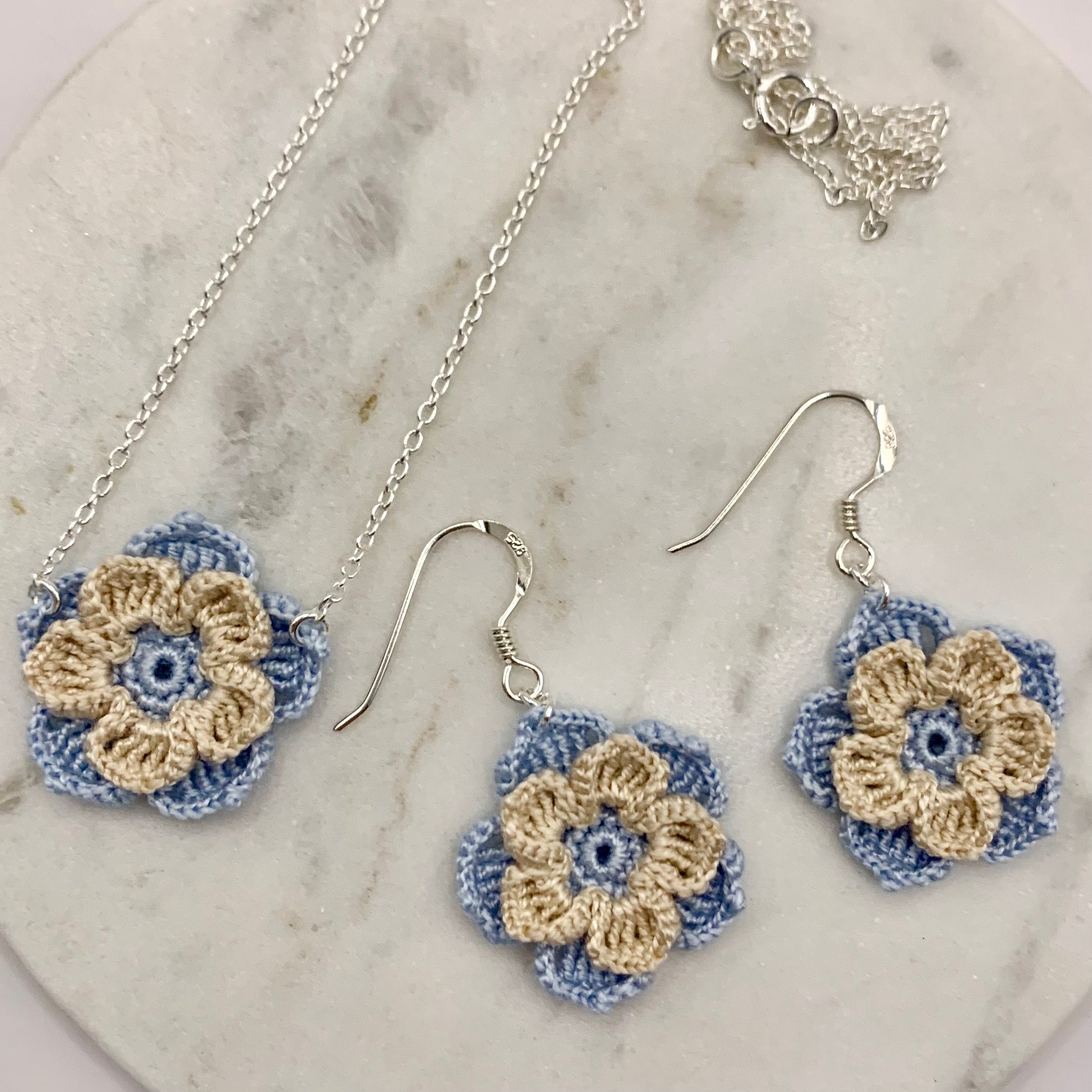 Aquest conjunt inclou les arracades i el collaret Cristina. Totes les flors estan fetes amb fil de cotó i un ganxet de 0,6 mil·límetres, i els ganxos i la cadena són de plata. Si adquireixes el conjunt, rebràs les joies en una mateixa caixeta, ideal per fer un regal especial.